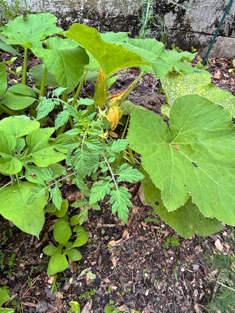 About a week later, I noticed lots of other green growth sprouting up around the red potato leaves – baby tomato plants, sunflowers, squash, beans, wildflowers – a haphazard sampling of everything we had composted from our garden last year.